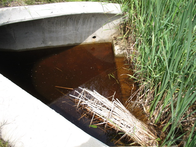 The following older picture shows that there is no adjustable control at the concrete culvert under CR 4 where Ditch 13 exits the Lake Edward vicinity. This is just a solid concrete weir that water in Ditch 13 must pass over to continue down Ditch 13 to North Long Lake. (Note that the County Highway Maintenance folks have had the cattails cleared from the intake side after this older photo was taken. Water can flow freely when high enough to go over the weir.)