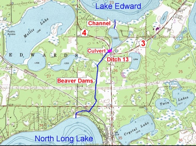 The lake level is a natural balancing act between water entering the lake minus water leaving the lake. The category of water entering the lake includes surface runoff of precipitation in our 8,000- acre watershed plus groundwater moving into the lake from precipitation that has percolated down into the groundwater. Water leaving the lake includes Ditch 13 (when lake levels are high enough for flows in Ditch 13), evaporation and plant photosynthesis (can add up to several feet of water over the year) plus groundwater flows out. In our case, groundwater moves generally from Pelican Lake toward Edward to North Long Lake and then further down to Gull Lake and the Mississippi River. In the bigger picture, Ditch 13 is normally not a substantial factor in the balancing act that determines the level of Lake Edward. Ditch 13 only becomes a substantial flow factor when Lake Edward is higher, say around its record high level which was 1208.18 in 2001. And even at those elevations, flows through the outlet culvert approach only 25 cubic feet per second (cfs), an impressive sight, but a small flow compared to the volume of water in the top two feet of the lake when its historically high.
