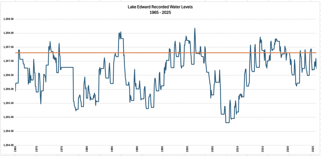 We are fortunate that by about 2006, the historic smaller steel outlet culvert was replaced with the fantastic new oval-shaped concrete culvert that we now see. The current concrete culvert has far more flow capacity than the previous old steel culvert that it replaced. But the culvert is sort of “perched” at a higher elevation to help us when Lake Edward gets historically high. Average Lake Edward water levels are low enough that hardly any or no water leaves the lake over the weir. For comparison, the elevation of the low part of the weir is 1206.7 and the historic average lake level is even lower, about 1206.5. So that means at the current average lake level, Lake Edward is about 0.2 (2-1.2 inches) below the lake elevation that would be necessary to flow out over the fixed concrete weir.